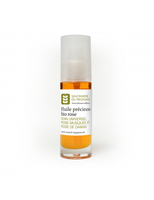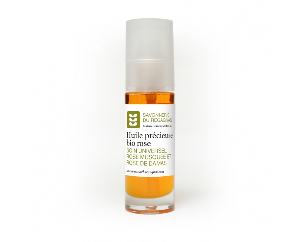 Composition : Huiles végétales bio (sésame, olive, jojoba, rose musquée), huiles essentielles bio (géranium, bois de rose, palmarosa, rose de Damas), vitamine E naturelle